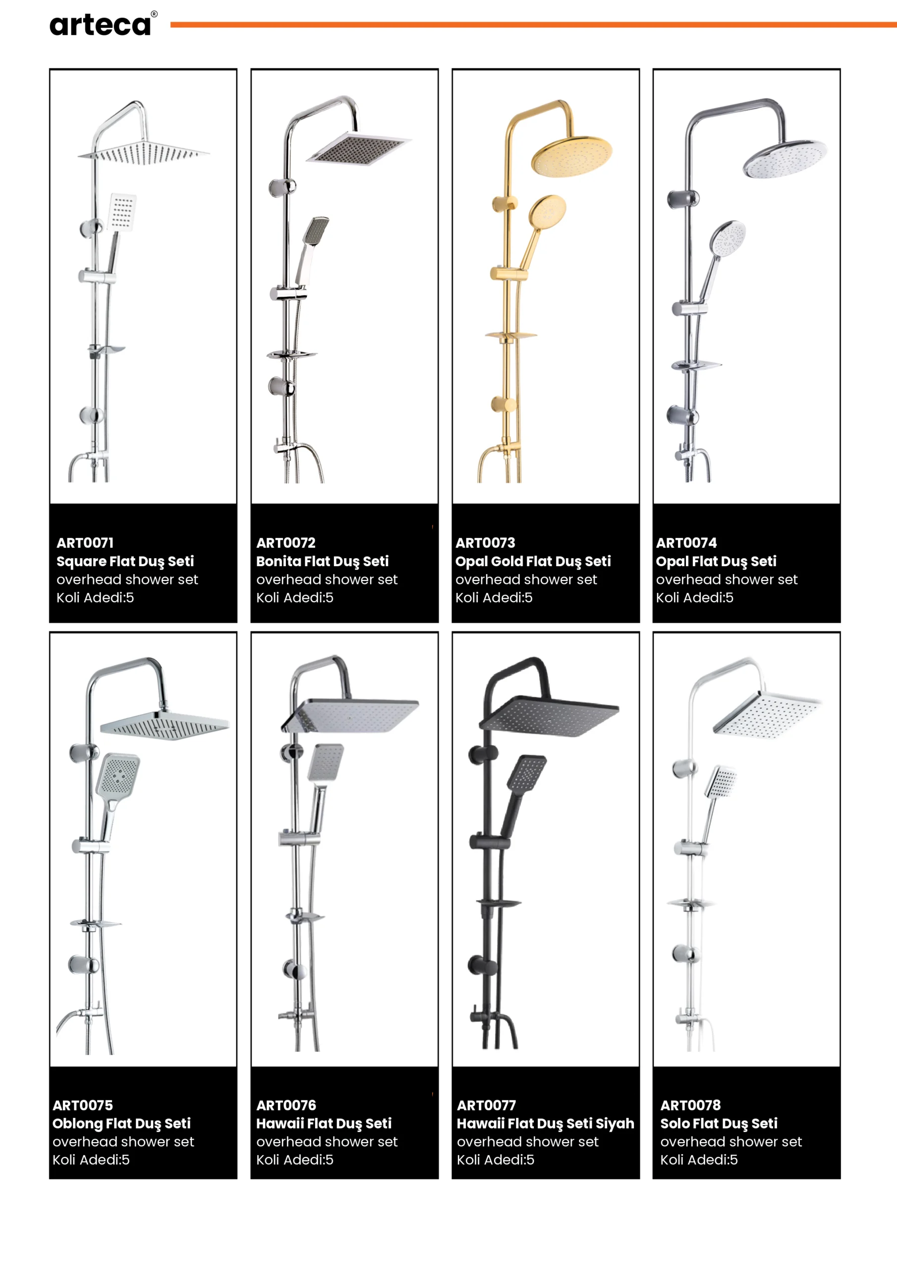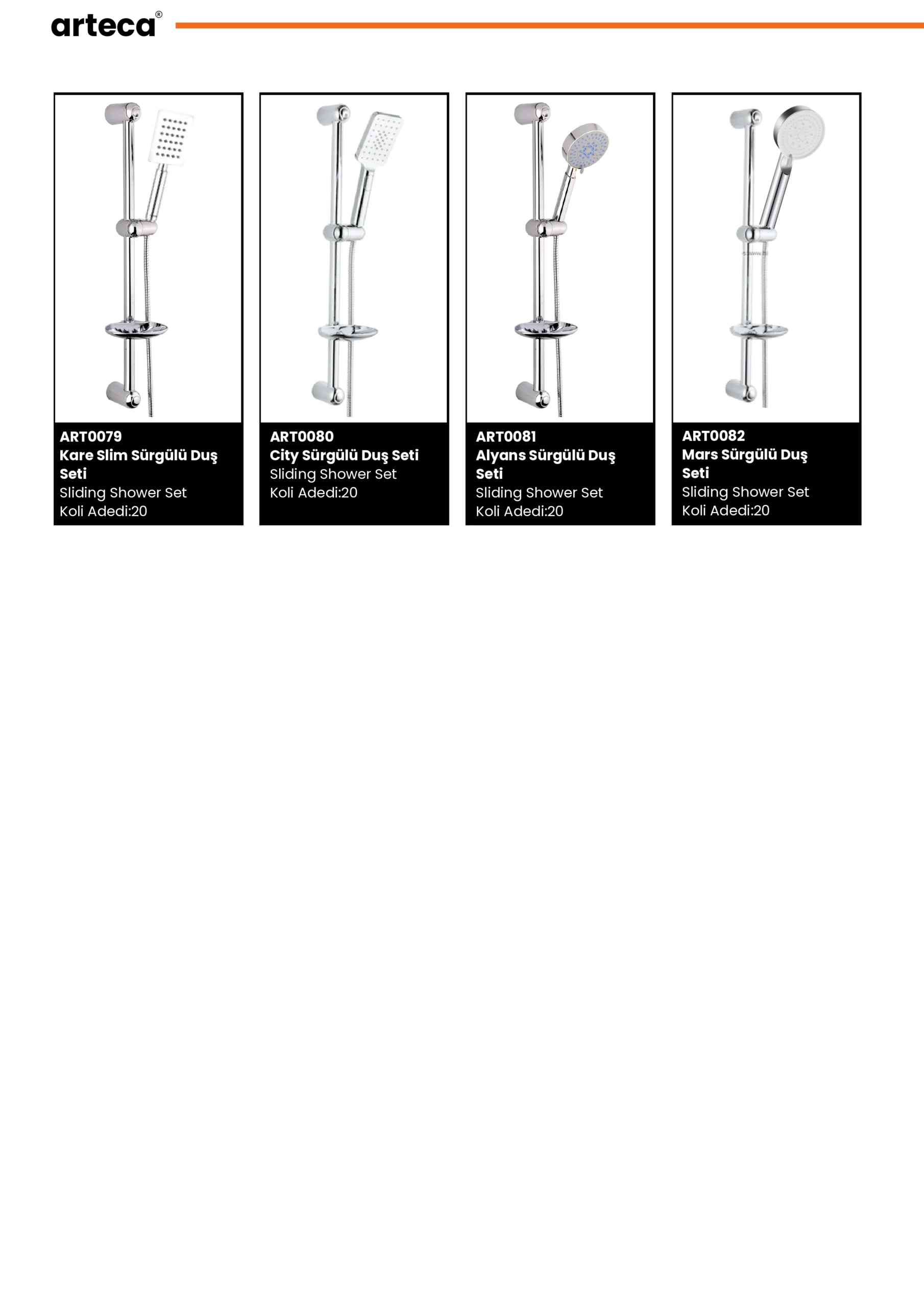 Arteca Duş Setleri Arteca duş setleri, modern çizgileriyle banyolara özgün bir karakter kazandırır. Due Serisi - Krom Beyaz Ferra Serisi Goya Serisi Hermes Serisi - Fırçalı Bronz - Rose Gold Hermes Serisi - Krom - Rose Gold Lado Serisi Lado Serisi - Fırçalı Bronz Leo Serisi Musluklar Salvo Serisi
